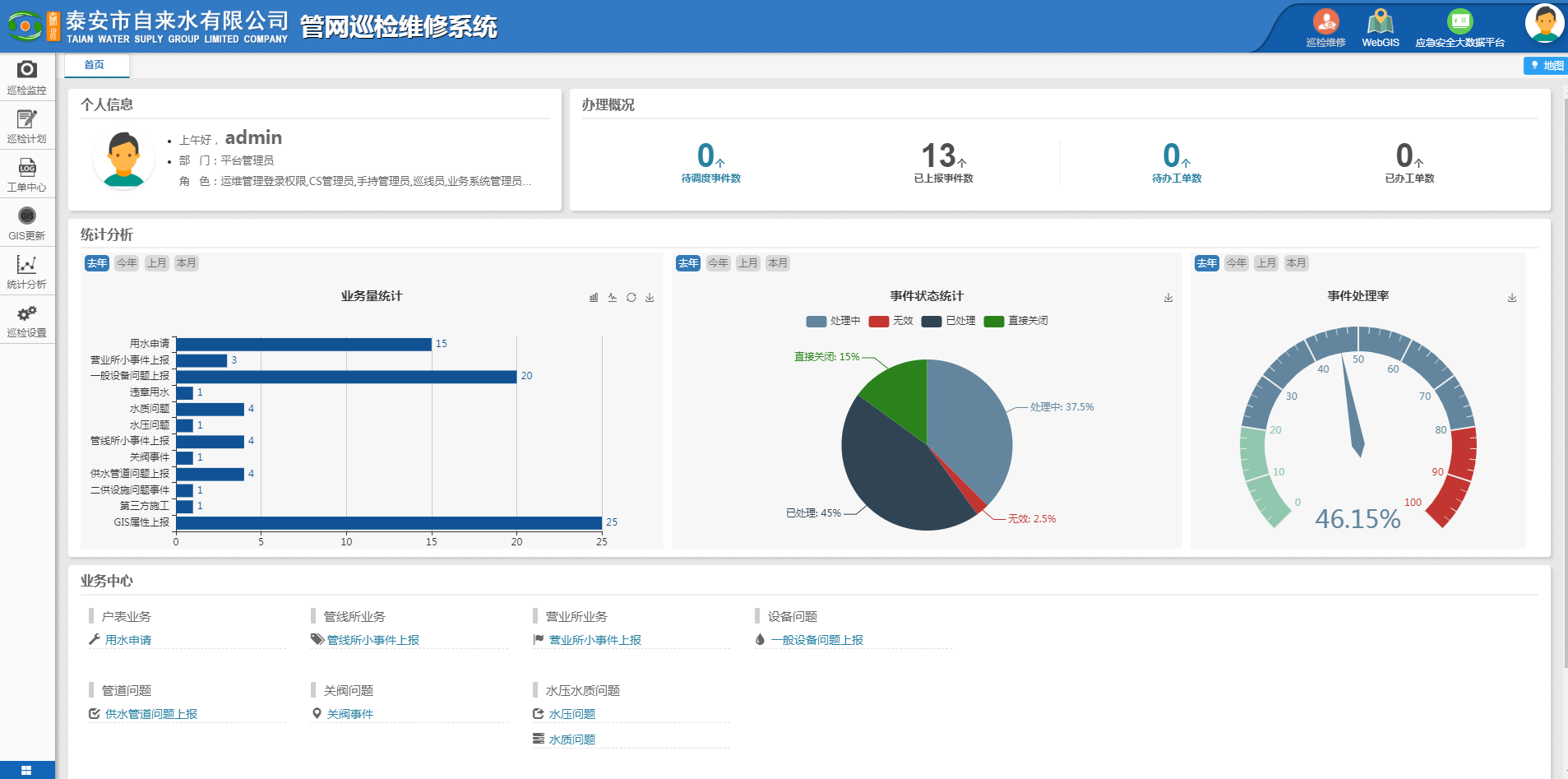 ????????公司領(lǐng)導組織有關(guān)部門、人員對供水GIS系統(tǒng)建設(shè)進行了認真細致的考察、調(diào)研,對公司業(yè)務(wù)流程梳理及系統(tǒng)接口需求進行了溝通整理。公司供水GIS系統(tǒng)包含四大模塊,有供水管理地理信息系統(tǒng)C/S(內(nèi)網(wǎng)系統(tǒng))、供水管網(wǎng)地理信息系統(tǒng)B/S(網(wǎng)頁客戶端)、供水管網(wǎng)巡檢系統(tǒng)、供水管網(wǎng)維修系統(tǒng),四大模塊中包含數(shù)據(jù)管理、數(shù)據(jù)分析、工單系統(tǒng)、巡線管理、移動終端監(jiān)控、運維管理等46項功能。項目自2020年4月初正式啟動, 2020年6月中旬完成四大模塊搭建及相關(guān)功能調(diào)試。